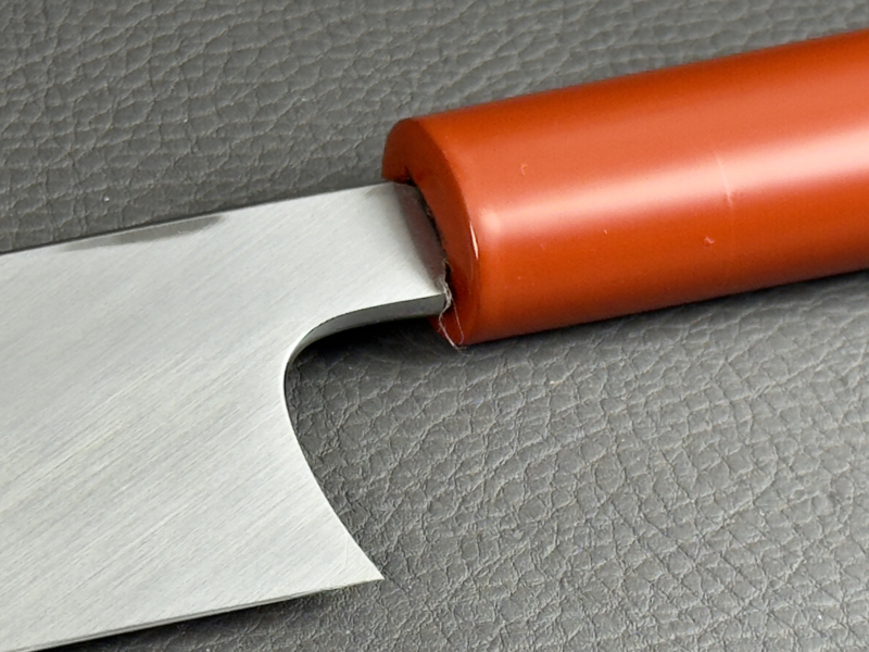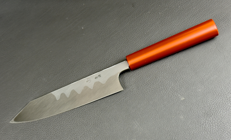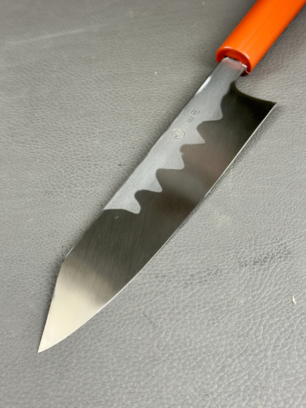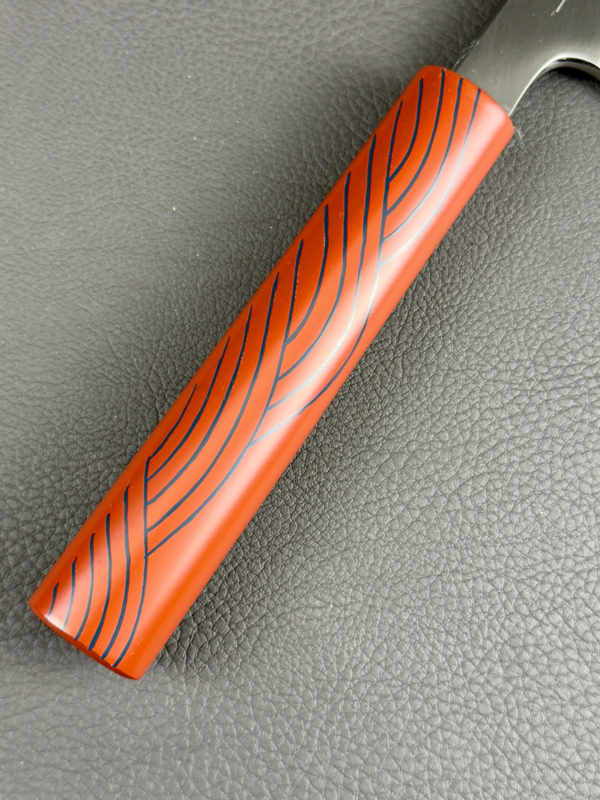 - Handle: Straight oval handle with traditional Japanese Urushi lacquer in orange with blue waves.