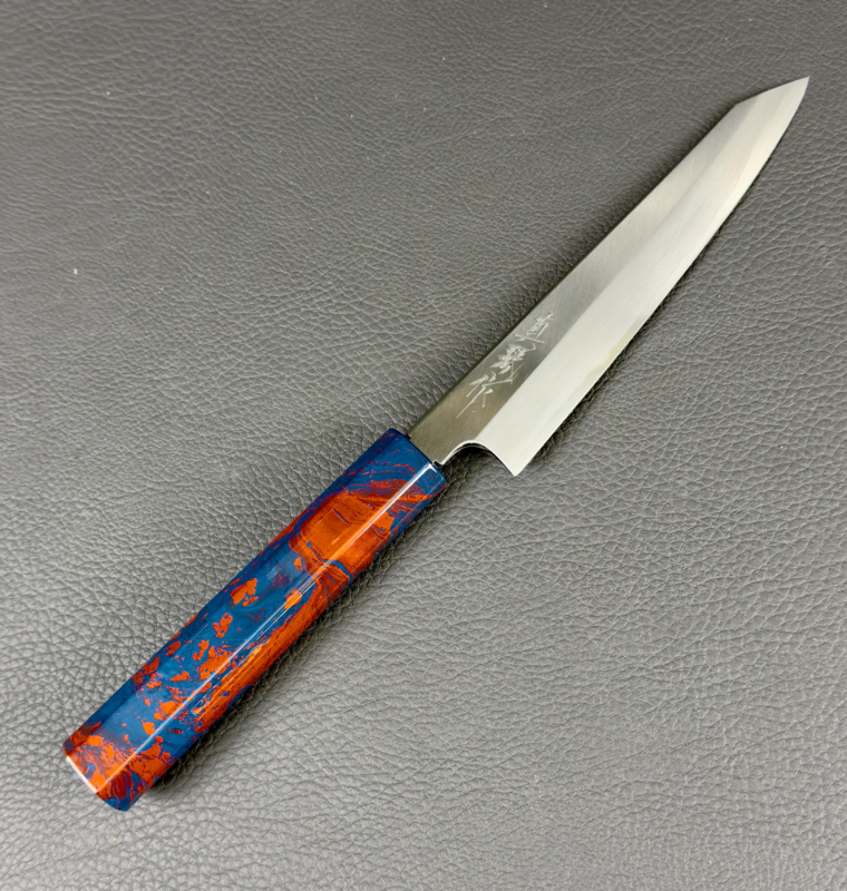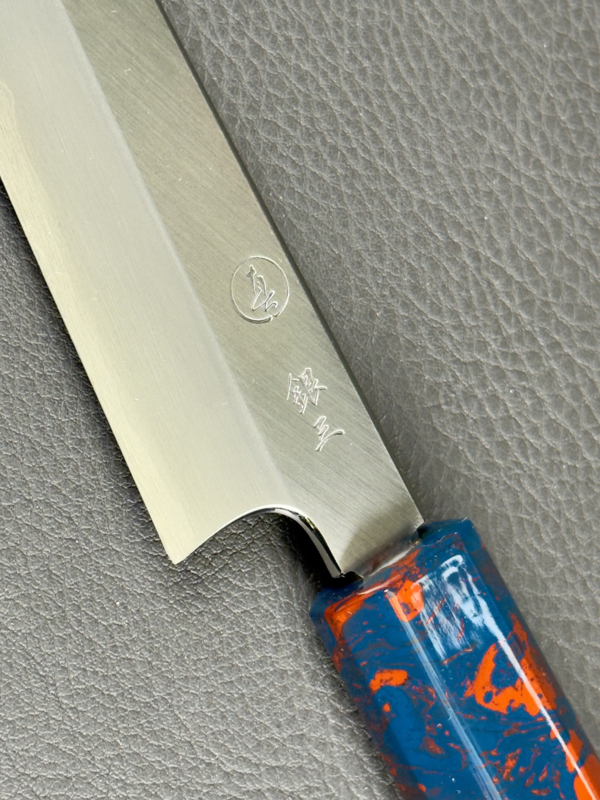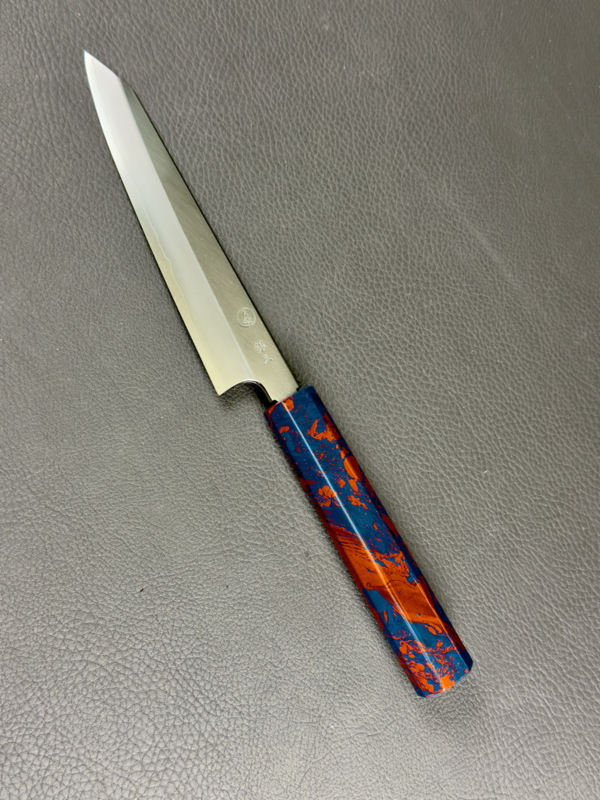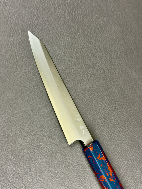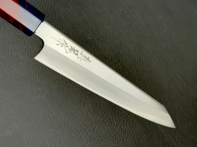 Double-edged sharpened blade with a core of special Yasuki Silver #3 (Ginsan) steel with a non-stainless steel layer. This knife is hand-forged by one of the master smiths in Sakai, and the blade is sharpened and finished by Makoto Tadokoro. The blade is sturdy and hand-sharpened and has no thickening, making sharpening very easy. The octagonal handle features a beautiful hand-applied Urushi lacquer. A Kiritsuke Petty is just like a regular Petty suitable for all small jobs. The knife is designed for preparing fish, meat, vegetables, and fruit and is the Japanese version of the European office knife.