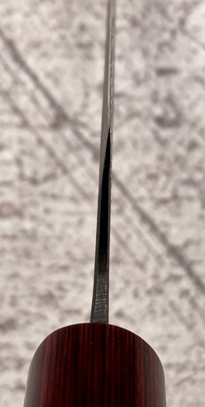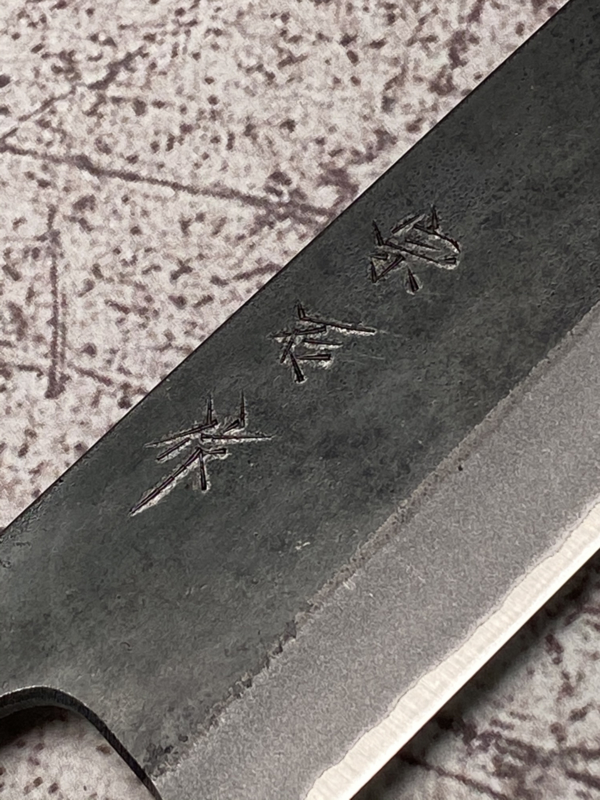 This Japanese Kiritsuke knife has a core of Japanese Aogami # 2 carbon steel with 2 softer types of steel as a protective layer (sanmai) on the outside. This double-sided sharpened knife has a black (Kurochi) protective layer. This knife is completely hand-forged by the master blacksmith Kosuke Muneishi-san and is unique in its kind. The blade is very thin and manually sharpened and has no thickening, which makes sharpening very easy.